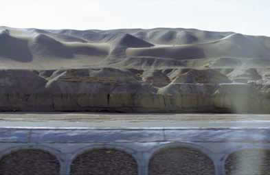 Este es un lugar que he tenido la fortuna de visitar, a fines de agosto, invitada por la Fundación Soong Ching Ling de China y la Academia Dunhuang, donde nos invitaron a realizar un viaje a lo largo de la Antigua Ruta de la Seda, desde Lanzhou hasta la Gran Muralla en Jiayuguan, Dunhuang, y la Gran Muralla incluso más al oeste en el desierto de Gobi. Este, por cierto, es muy interesante. Usted ve que solo hay desierto, pero ahí ve estos arcos: este es el inicio de la nueva línea ferroviaria, que recorrerá todo el tramo desde Lanzhou hasta Urumqui y más allá. Se está construyendo a gran velocidad.