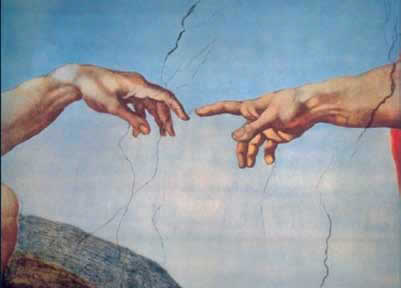 Fragmento del fresco de Miguel Ángel en el cielo de la Capilla Sixtina, Dios toca la mano de Adán. |