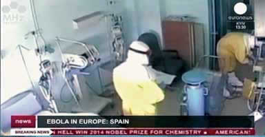 El Ébola se ha propagado ahora desde la “zona de riesgo” en África occidental a Europa y a Estados Unidos, que hasta ahora, no están preparados para enfrentarlo. Aquí trabajadores de la salud en España usan ropas protectoras para tratar a un paciente de Ébola. |