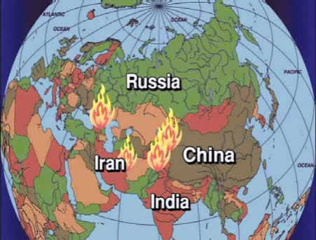 Estas dos imágenes fueron sacadas del video de Lyndon LaRouche de 1999 “Tormenta sobre Asia”, que manifiesta una presciencia, dijo Zepp-LaRouche, en cuanto que mostraba hacia donde conducirían las políticas de los angloamericanos. |
