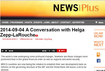 24 de septiembre de 2014 - La fundadora del Instituto Schiller, Helga Zepp-LaRouche, concedió esta entrevista al programa "Gente que Sabe" de Radio Internacional de China [http://english.cri.cn/7146/2014/09/04/3621s842967.htm] el 4 de septiembre de 2014, durante su reciente visita a China. El anfitrión es Zheng Chenguang.
