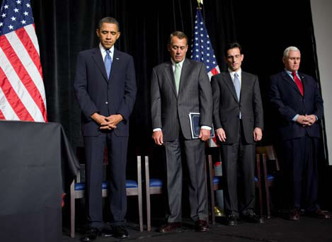 White House/Pete Souza President Obama and his Republican Party allies (House Speaker John Boehner, Majority Leader Eric Cantor, and Rep. Mike Pense) observe a moment of silence, perhaps for the U.S. Constitution, which they have just killed. |