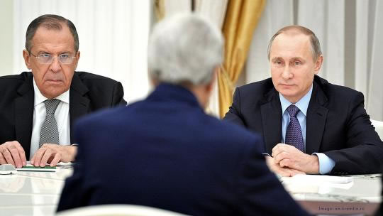 Secretary of State John Kerry confers with his Russian counterpart and Russian President Putin. |