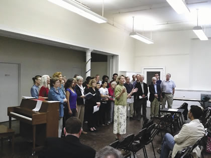 Diane Sare, director of the Schiller Institute choruses in the New York City area, working with members of the Manhattan Schiller Institute Chorus. |