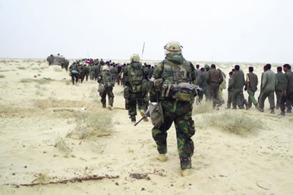 U.S. Marines from the 2nd Battalion, 1st Marine Regiment, escort captured enemy prisoners of war in Iraq. |