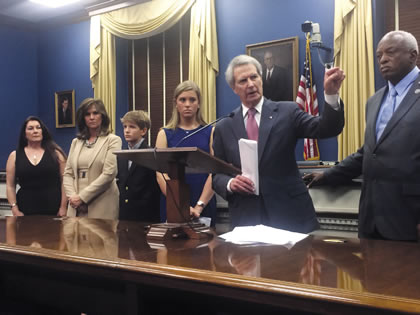 Rep.Walter Jones at a press conference to urge release of the 28 pages of the 9/11 report suppressed by Vice President Dick Cheney and President Obama. Joining him, left to right, members of the 9/11 families: Ellen Saracini; Terry, Justin, and Kaitlin Strada; and Abraham Scott. |