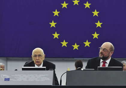 Martin Schulz (right) in 2014 when he was President of the European Parliament. At left is the then Italian President, Giorgio Napolitano. |