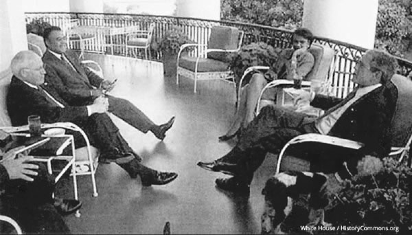 There is a picture formerly available from the Bush Presidential Library which shows George W. Bush, Dick Cheney, Condoleezza Rice, and Prince Bandar, Saudi Arabia’s U.S. Ambassador, on the White House balcony two days after September 11, 2001. The men are smoking cigars. Reporters inquiring about the photo more recently have been told it is no longer available from the Bush Library.[2] Maybe the picture in this case says more than a thousand words ever could. Again, two days after almost 3,000 Americans were murdered by 19 hijackers, 15 of whom were Saudis, the Saudi Ambassador yucks it up with the President, Dick Cheney, and the National Security Adviser on the White House balcony.