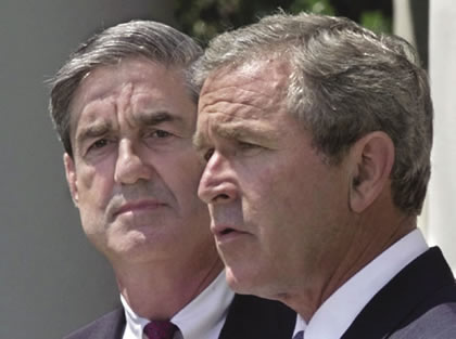 Based on family services rendered, President George W. Bush returned Mueller to Main Justice as acting Deputy Attorney General in the early days of his Administration, before appointing him, in July of 2001, to head the FBI. He assumed that office on Sept. 4, 2001, only days before Sept. 11. As we shall see, he played a commanding role in covering up for the perpetrators of the murder of nearly 3,000 Americans on that date, while overseeing the creation of the police state measures which followed that attack.